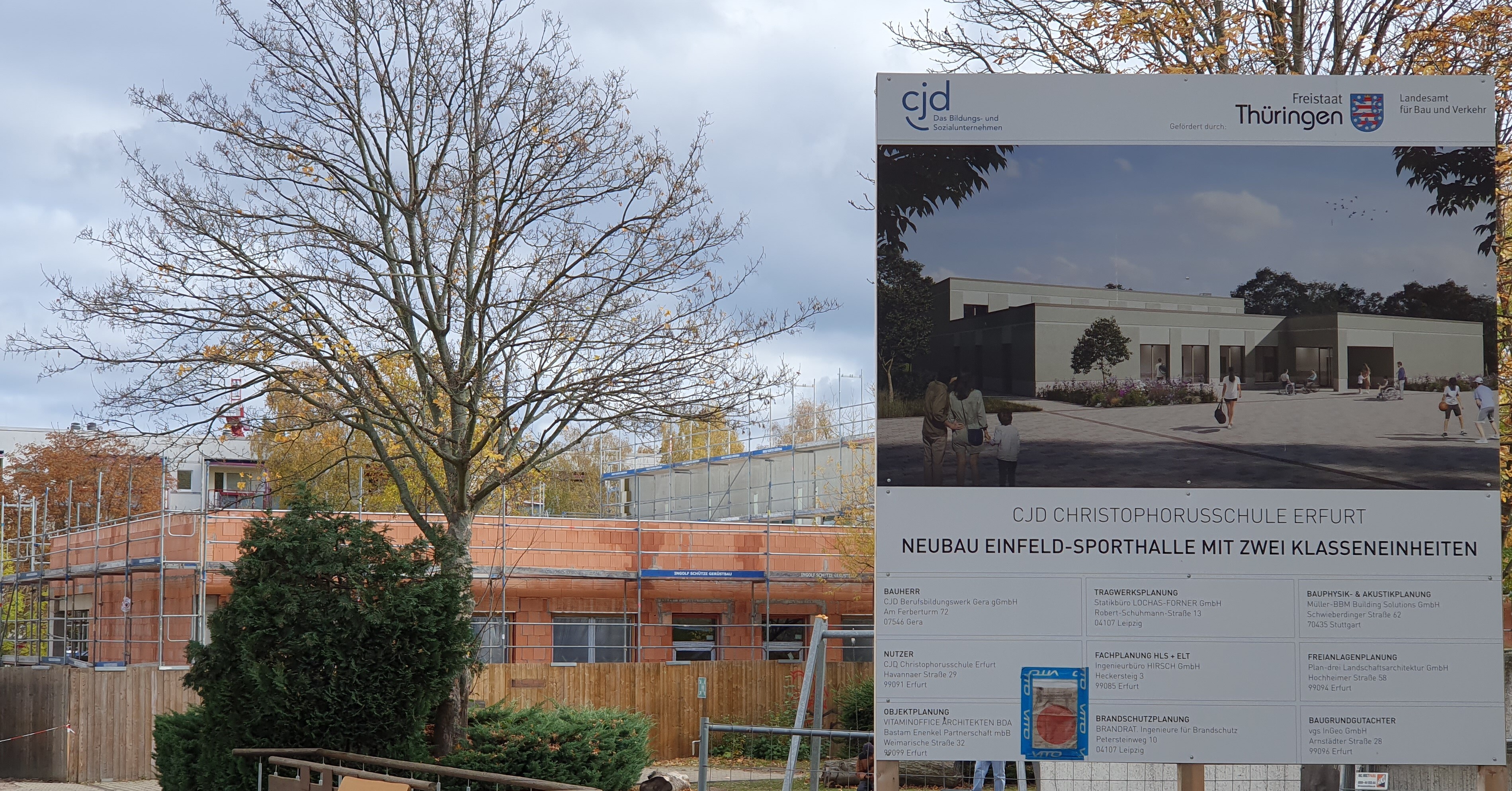 In Erfurt entsteht der Neubau einer Multifunktionssporthalle mit zwei Klasseneinheiten für die Christophorusschule. Die eingeschossige Halle bietet Platz für den Schulsport und vereint eine großzügige Spielfläche (27 x 15 m) mit Funktionsräumen und Klassenzimmern. Die Abmessungen des Gebäudes betragen ca. 39 x 33 m bei einer Höhe von 8 m. Die Halle ist als Einfeldkonstruktion ohne Unterkellerung geplant und fügt sich harmonisch in das Schulgelände ein.