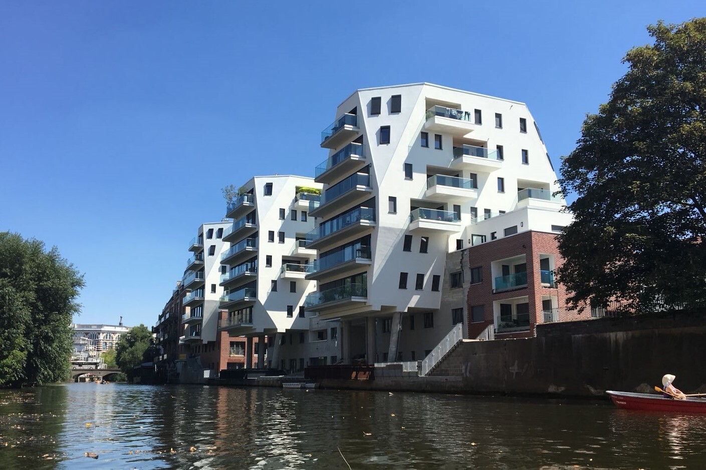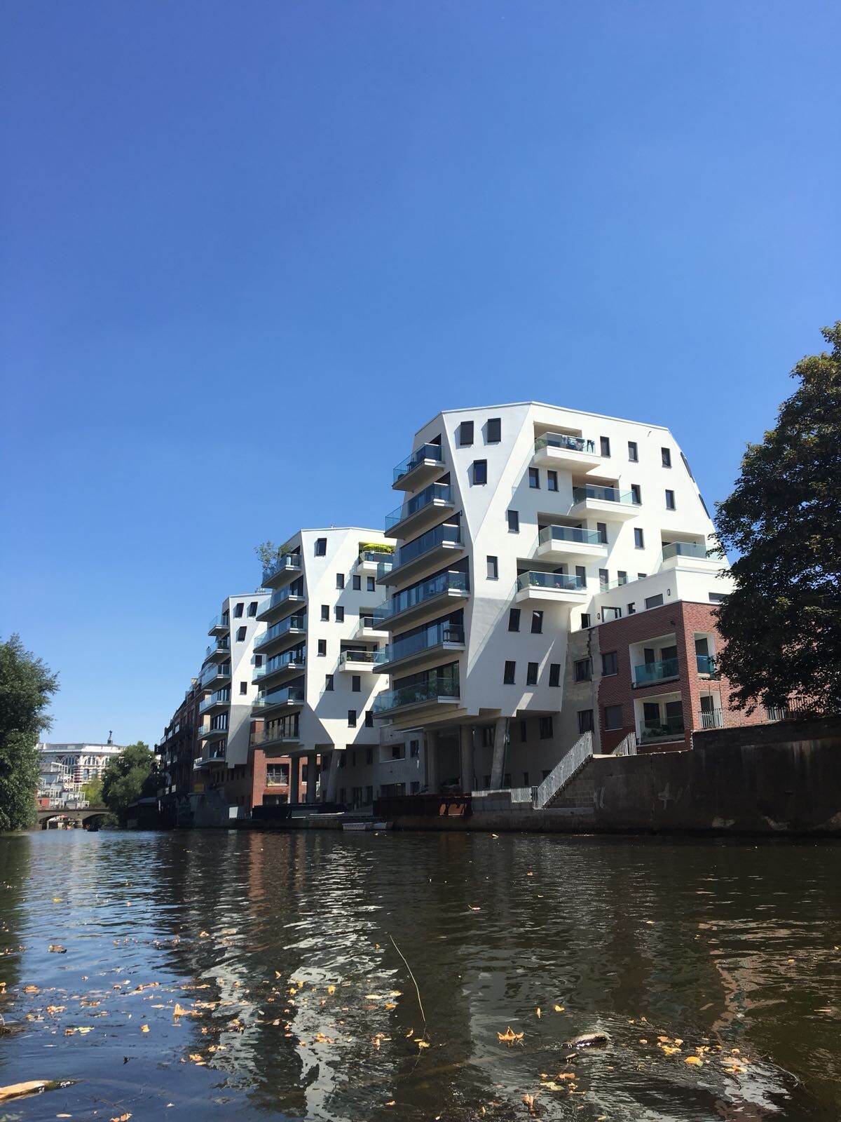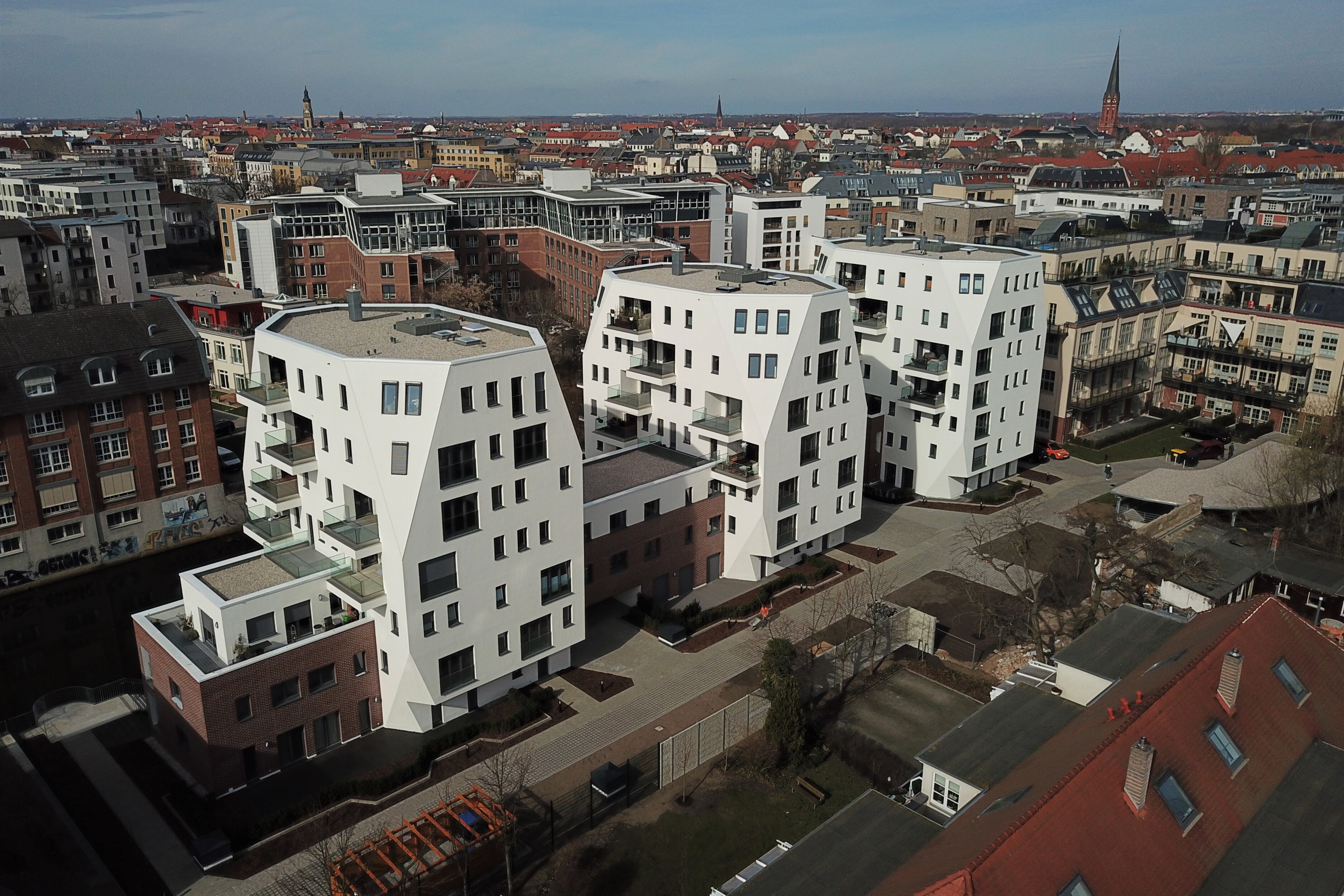 Das Projekt „Riverhouse“ in Leipzig umfasst drei achtgeschossige Wohngebäude mit gemeinsamer Tiefgarage in innerstädtischer Lage am Kanal der Weißen Elster. Die Gebäude wurden als Massivbau konzipiert und kombinieren Wohnnutzung mit weit auskragenden Balkonen, die über das Wasser hinausreichen und eine prägnante Gebäudekubatur erzeugen.