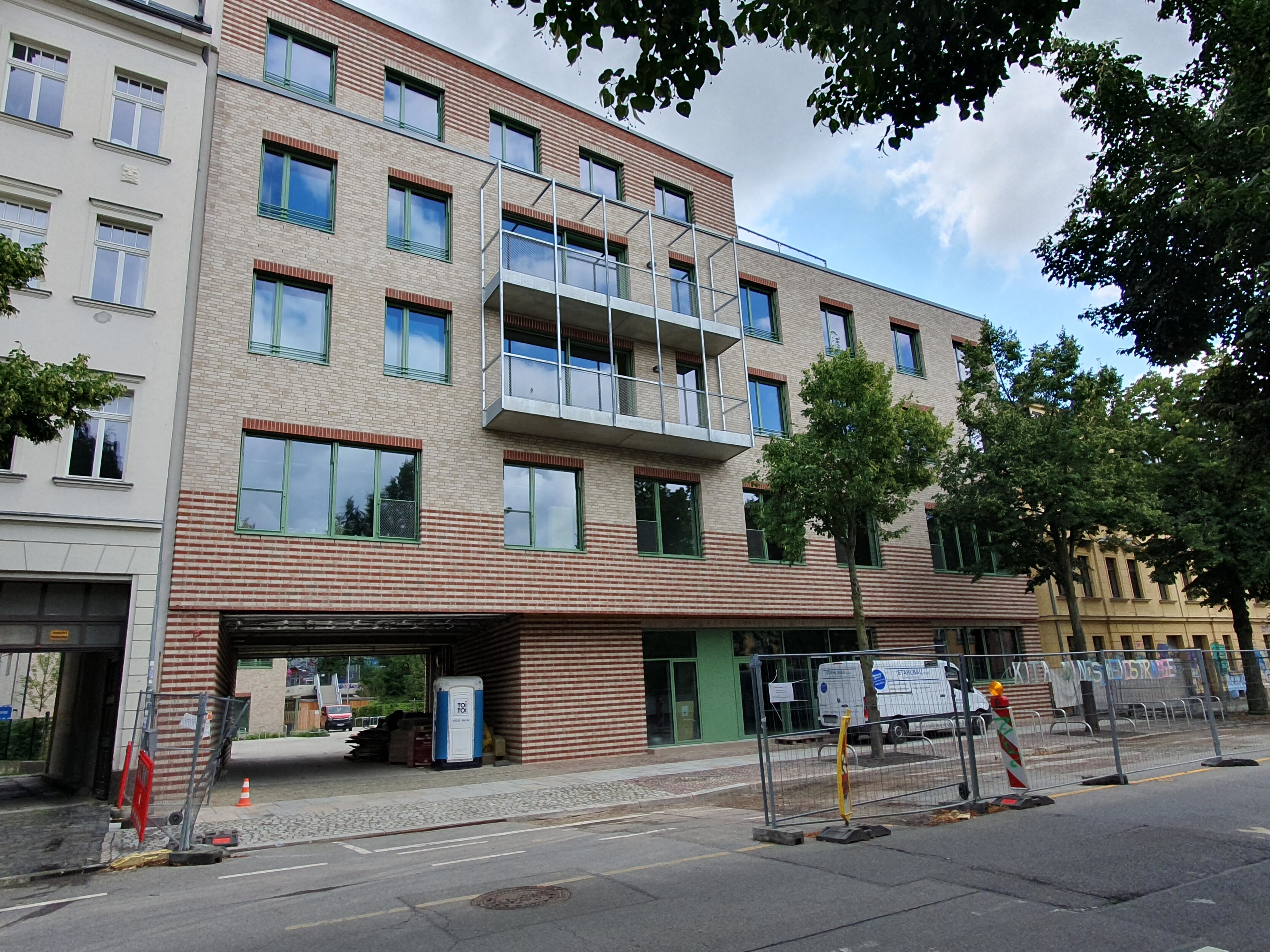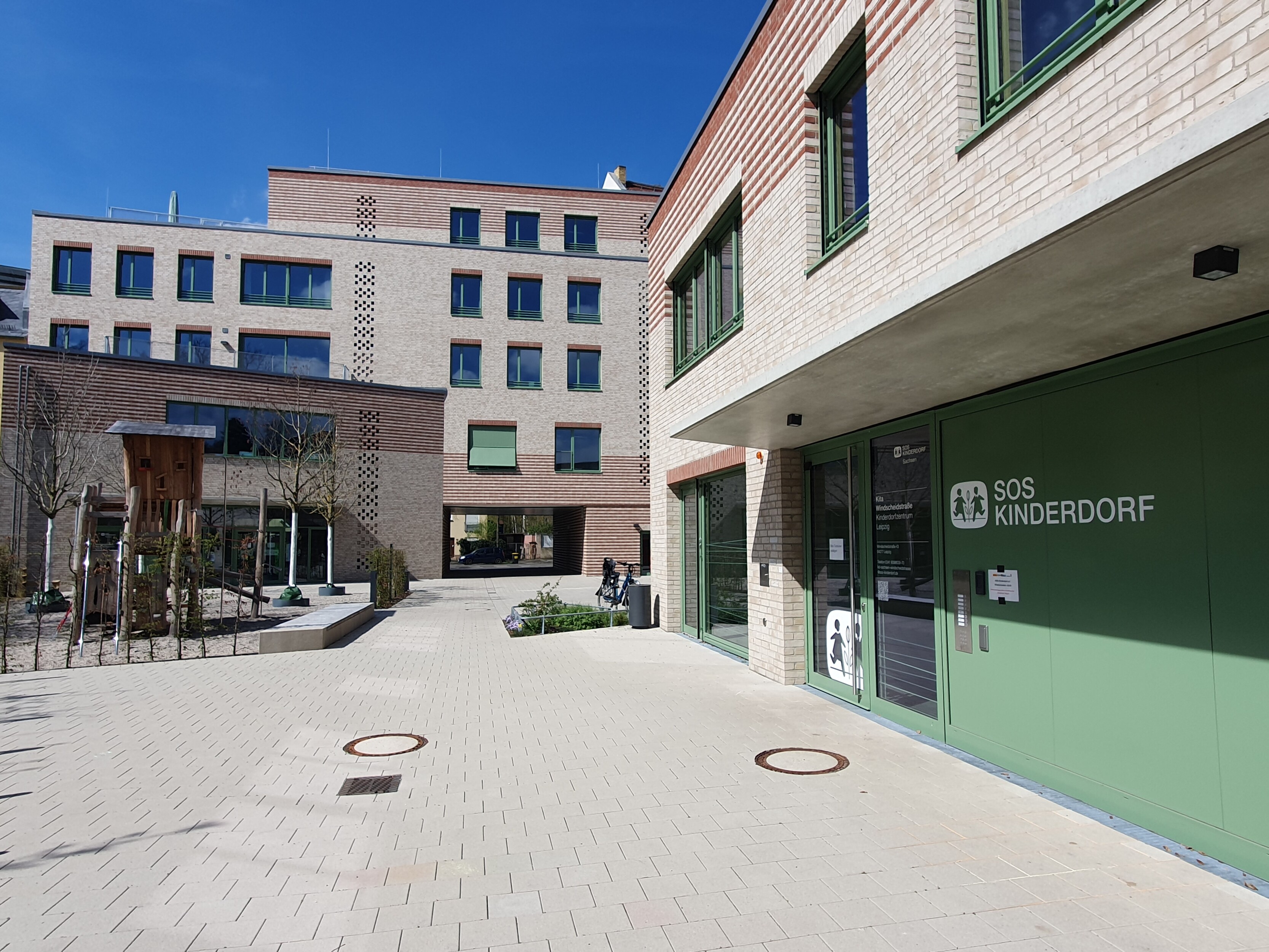 Das SOS Kinderdorf baut auf einer Brachfläche neben dem Werk II in Leipzig Connewitz ein neues Kinderdorfzentrum. Im Vorderhaus an der Windscheidstraße entsteht eine Begegnungs- und Beherbergungsstätte für Kinder, ein Café und Büroflächen. Zwei Spannbetonbinder über der Durchfahrt trragen die aufgehenden 4 Geschosse und ermöglichen so eine breite Durchfahrt für die Feuerwehr, vornehmlich jedoch für den sich öffnenden Zugang in einen geräumigen Innenhof. Hier, im rückwärtigen Bereich des langgestreckten Grundstückes, ist die geplante zweigeschossige Kindertagesstätte bereits fertiggestellt. Die Räumlichkeiten des Vorderhauses, z.B. das Cafe und erste Wohngruppen,  gehen in den nächsten Wochen schrittweise in Nutzung.