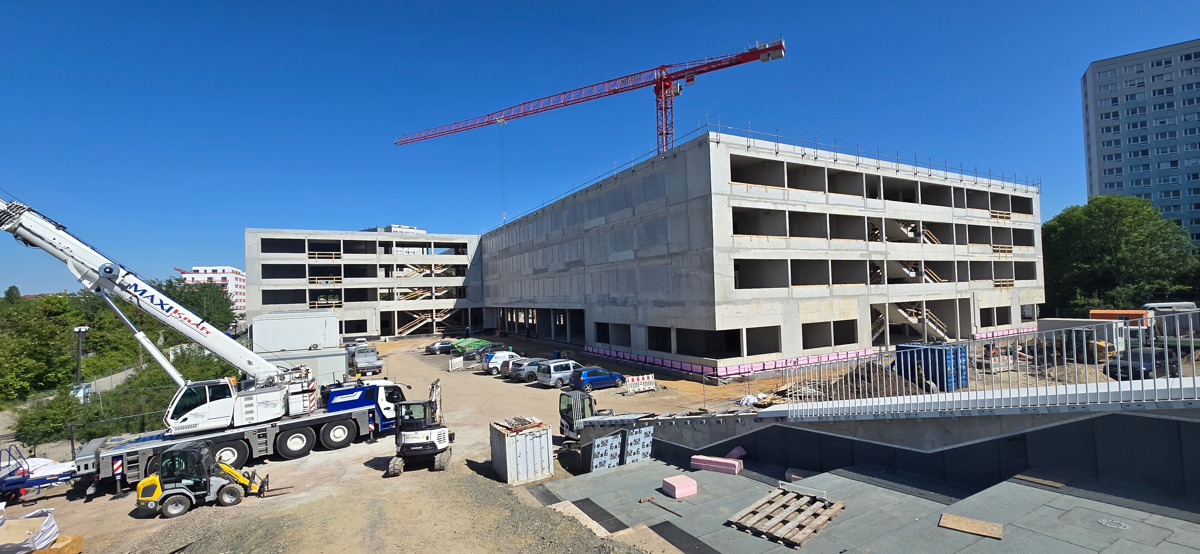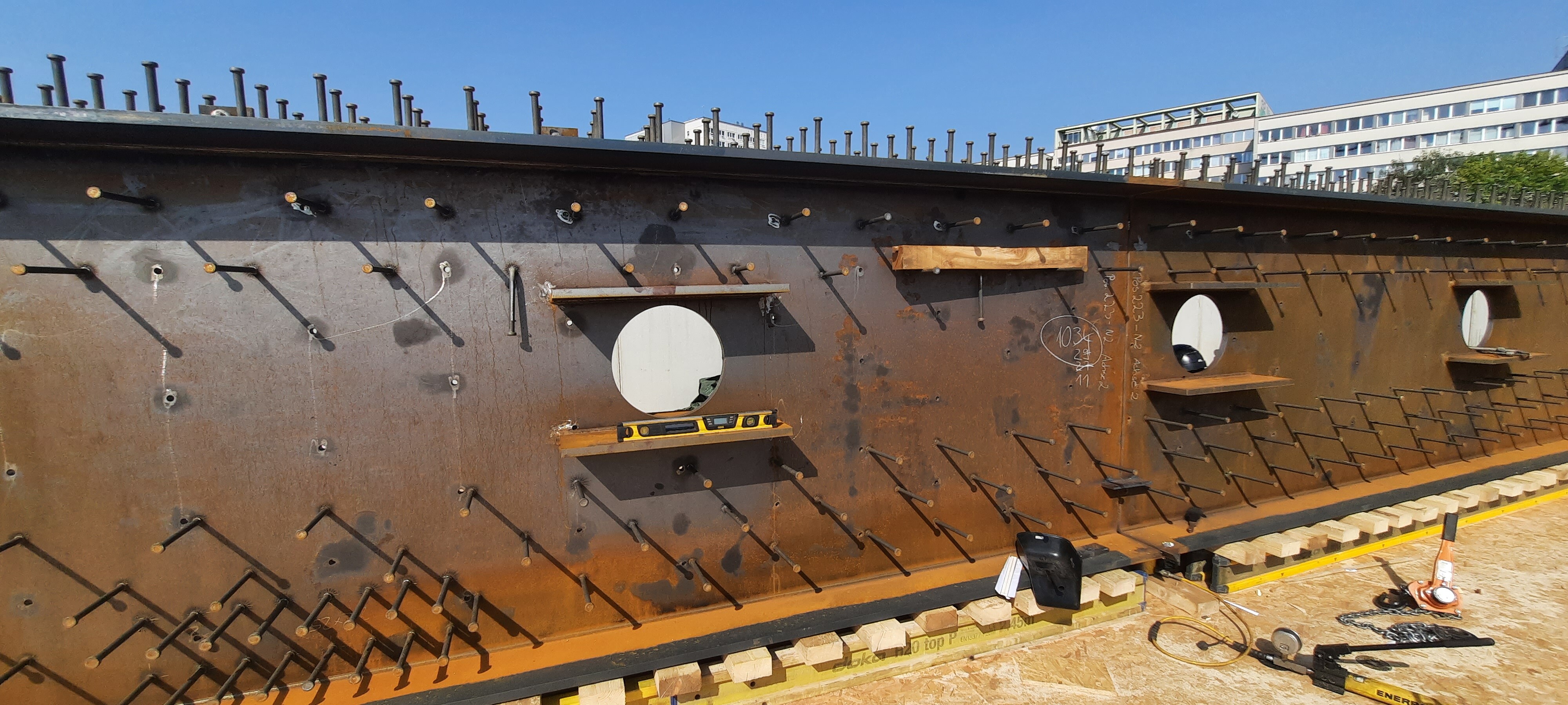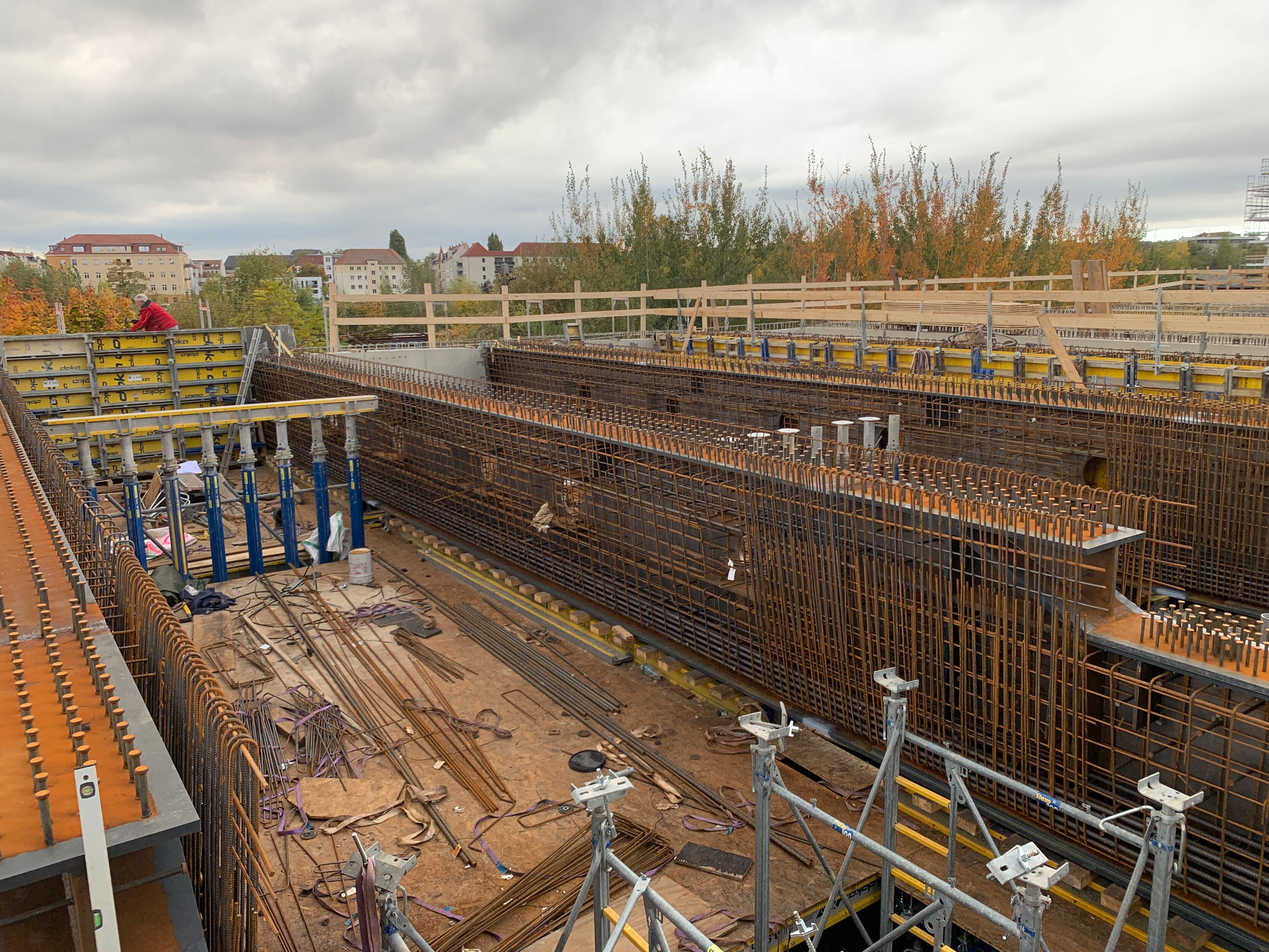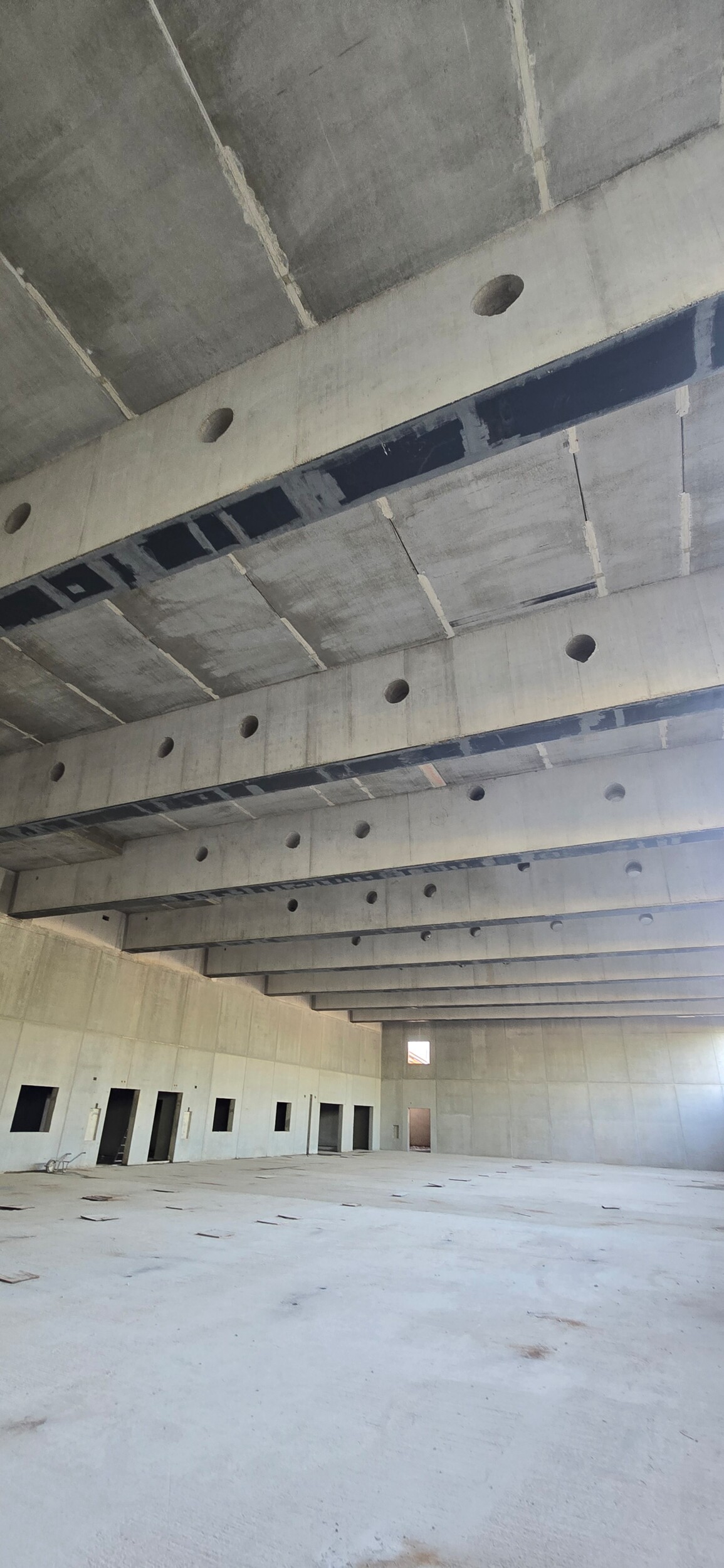 Die größte Herausforderung lag in der Realisierung der Sporthalle im Untergeschoss mit darüberliegenden Klassenräumen. Die große Deckenspannweite erforderte eine leistungsfähige Tragkonstruktion, die gleichzeitig wirtschaftlich und terminsicher umsetzbar sein musste. Die Lösung bestand aus einer Kombination von Massivbau und Stahlverbundträgern mit 23 Metern Spannweite, die das Untergeschoss stützenfrei überspannen. Flachdecken bieten flexible Grundrisse für den Schulbetrieb, während die robuste Konstruktion eine dauerhafte Tragfähigkeit gewährleistet.
